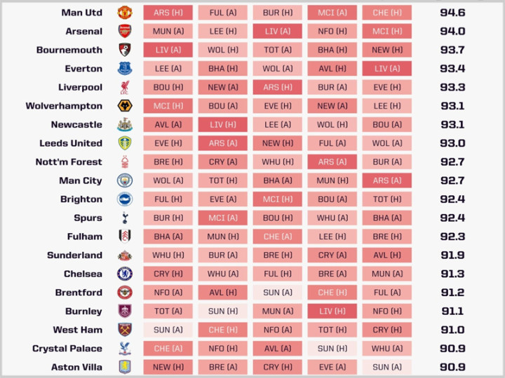 根据这套系统,曼联前五个对手包括阿森纳、富勒姆、伯恩茅斯、曼城和切尔西,五个对手的平均难度是最大的,高达94.6分,随后的阿森纳为94分,其中包括曼联、利物浦和曼城三个传统豪门,最轻松的是阿斯顿维拉,只有90.9分,五个对手分别是纽卡斯尔、布伦特福德、水晶宫、埃弗顿和桑德兰。