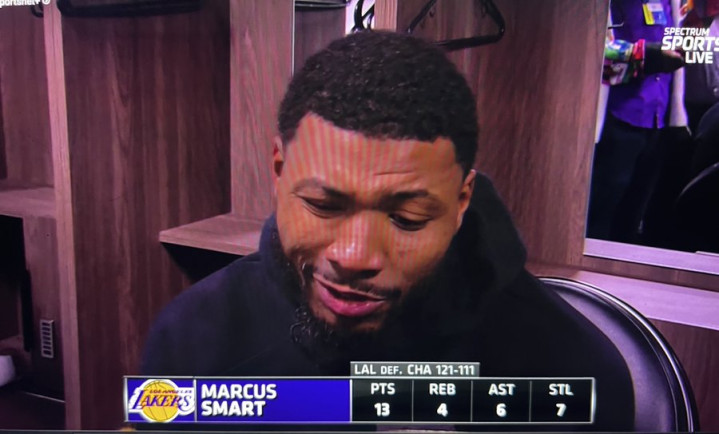 本场比赛,湖人球员马库斯-斯马特全场出战37分钟,9投4中、三分7中3、罚球2中2得到13分4篮板6助攻7抢断。
