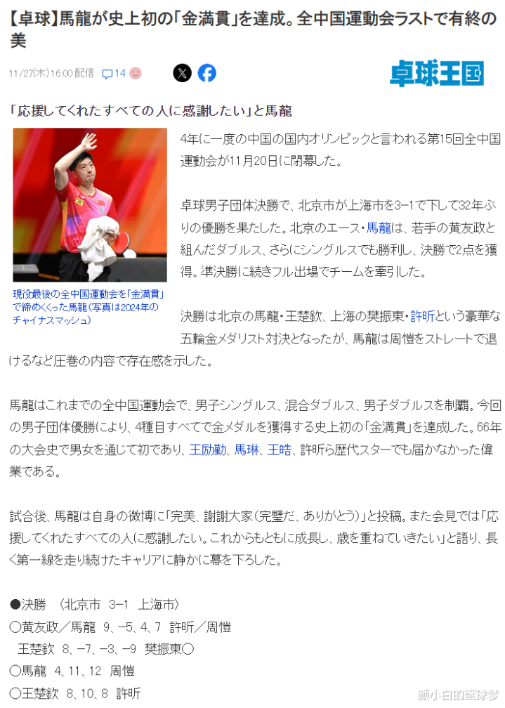 北京时间11月27日,日本媒体《乒乓球王国》发文祝贺马龙在第十五届全运会拿到冠军,标题是马龙达成史上首次全运会金满贯,在中国全运会最后一场比赛也很完美。