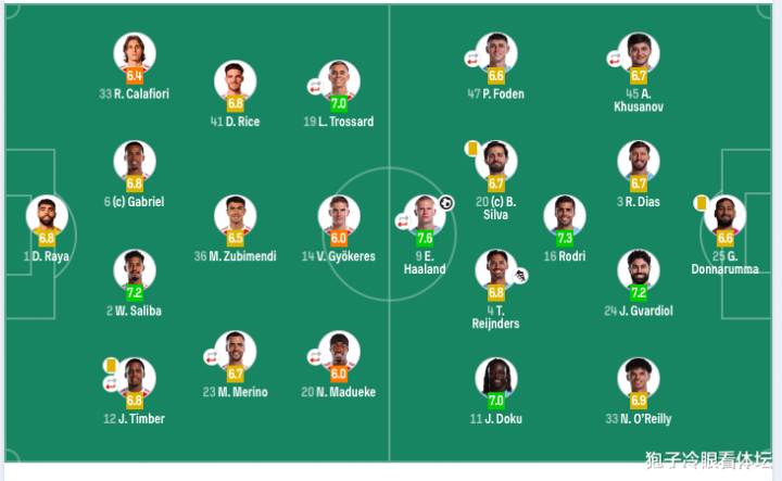 曼城首发:25-多纳鲁马、45-胡桑诺夫(46’27-努内斯)、3-鲁本-迪亚斯、24-格瓦迪奥尔、33-奥赖利(87’5-斯通斯)、16-罗德里、20-B席、4-赖因德斯、47-福登(67’6-阿克)、11-多库(87’26-萨维尼奥)、9-哈兰德(76’14-尼科-冈萨雷斯)。