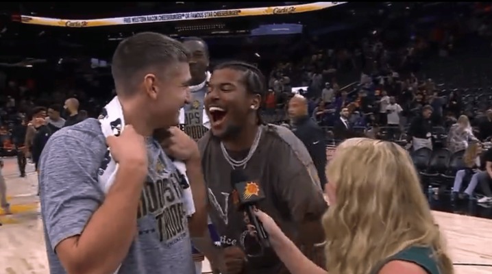 赛后,在格雷森-阿伦接受采访的时候,一旁的队友杰伦-格林入镜,并大喊道: