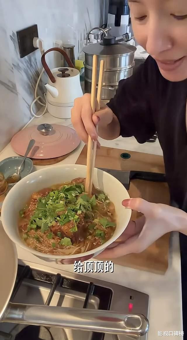 视频的最后,董洁一大早起床做早餐。就是昨天做好的红烧牛肉加热,煮了一碗面。