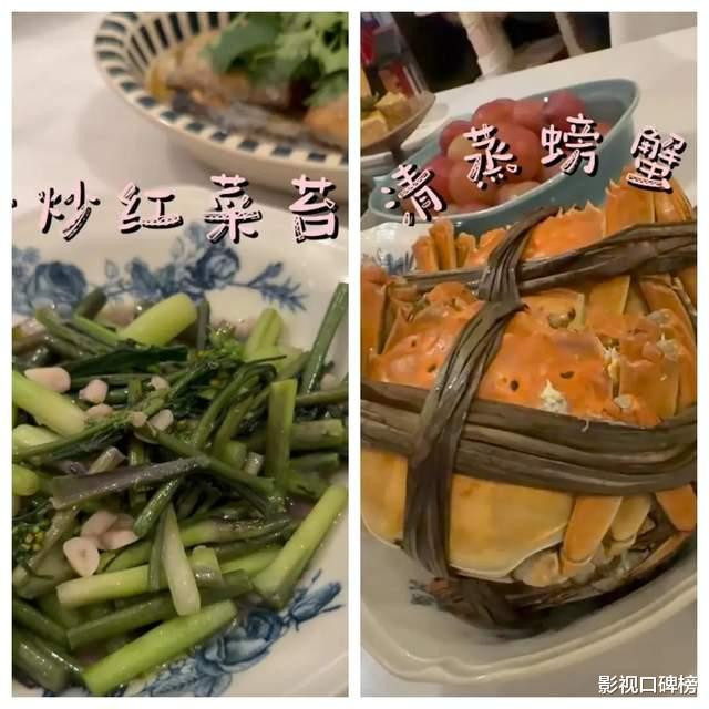董洁将顶顶(儿子)接回家后将做好的一桌菜肴端上饭桌,有红烧牛腩,红烧带鱼、辣椒炒肉、清炒红菜苔、清蒸螃蟹,十分丰盛。隔着屏看到都想吃,顶顶一定吃得很香。