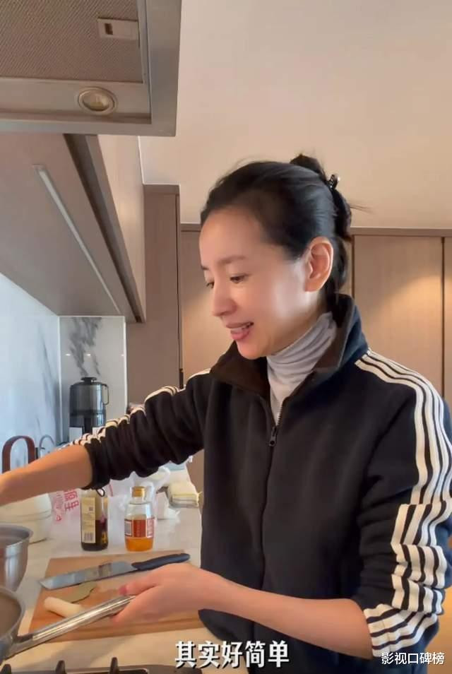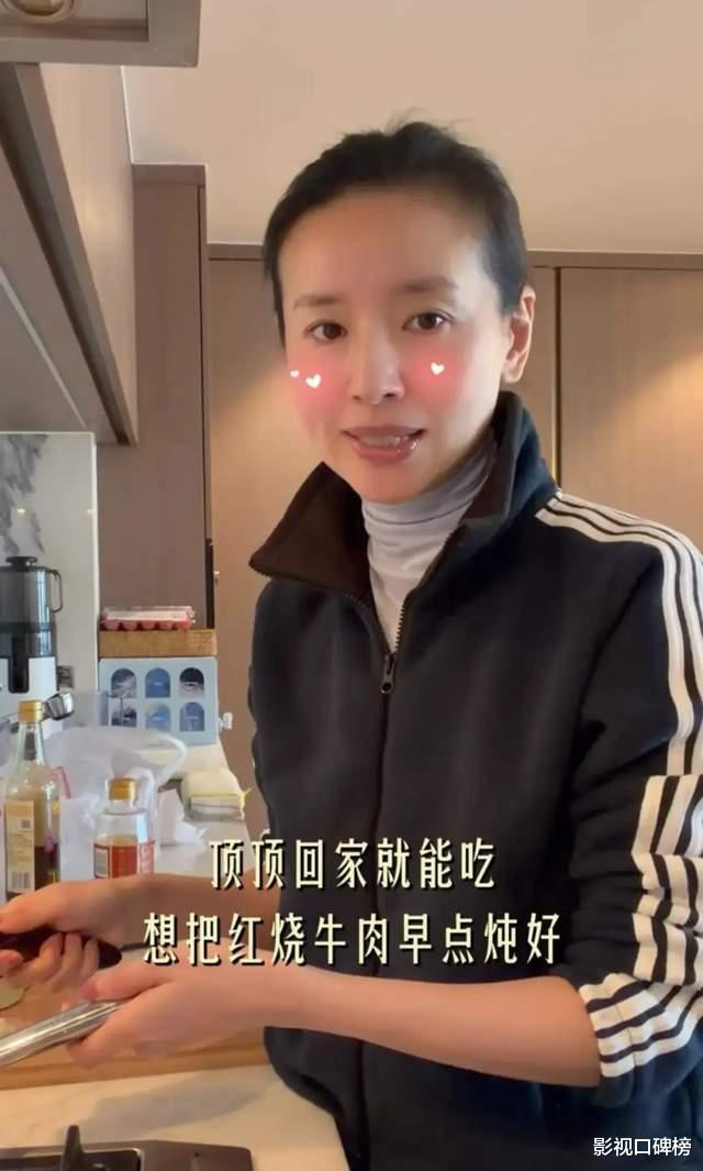 董洁一边在厨房做饭,洗菜,一边对着镜头说:真实我的生活很简单,送完孩子买个菜。今天的牛肉特别好就买了牛腩,炖一个红烧牛肉……顶顶(儿子)回家就能够吃。从她的言语中听出,心态很好,整个人很放松。