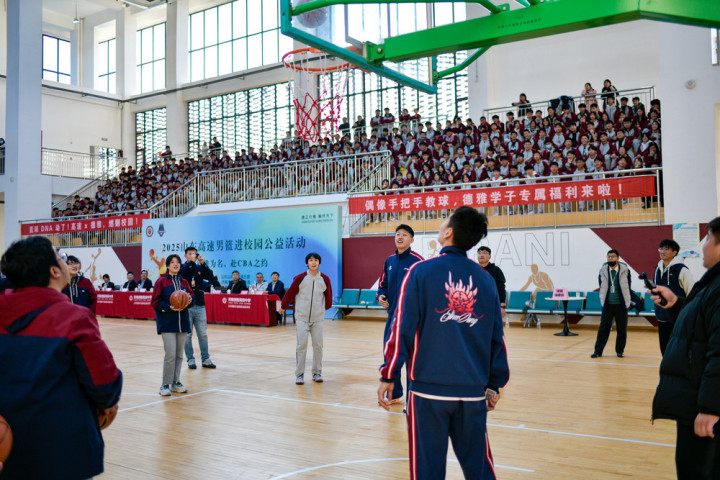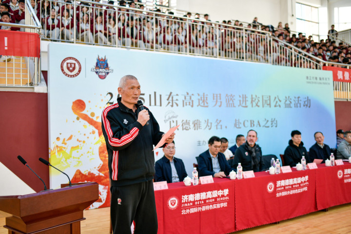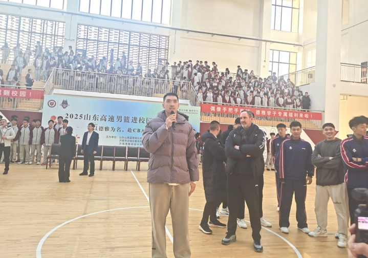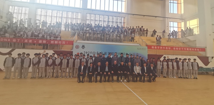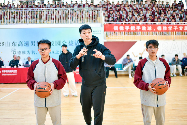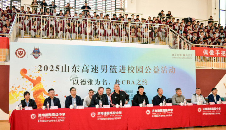 11月27日下午,"2025山东高速男篮进校园"公益活动走进济南德雅高级中学,山东山高篮球俱乐部总教练、总顾问纪民尚,山东高速男篮助理教练李敬宇,山东高速男篮外籍助理教练塞巴斯蒂安,济南市历城区委教育工委常务副书记、区教育体育局党组书记、局长王永军,历城区唐冶街道办事处党工委副书记、办事处主任李强,历城区教育体育局党组成员、副局长杨尚剑,历城区唐冶街道办事处副主任张吉强,济南德雅高级中学董事长韩龙,校长于子芹,党支部书记王贵臣,以及德雅师生出席活动。