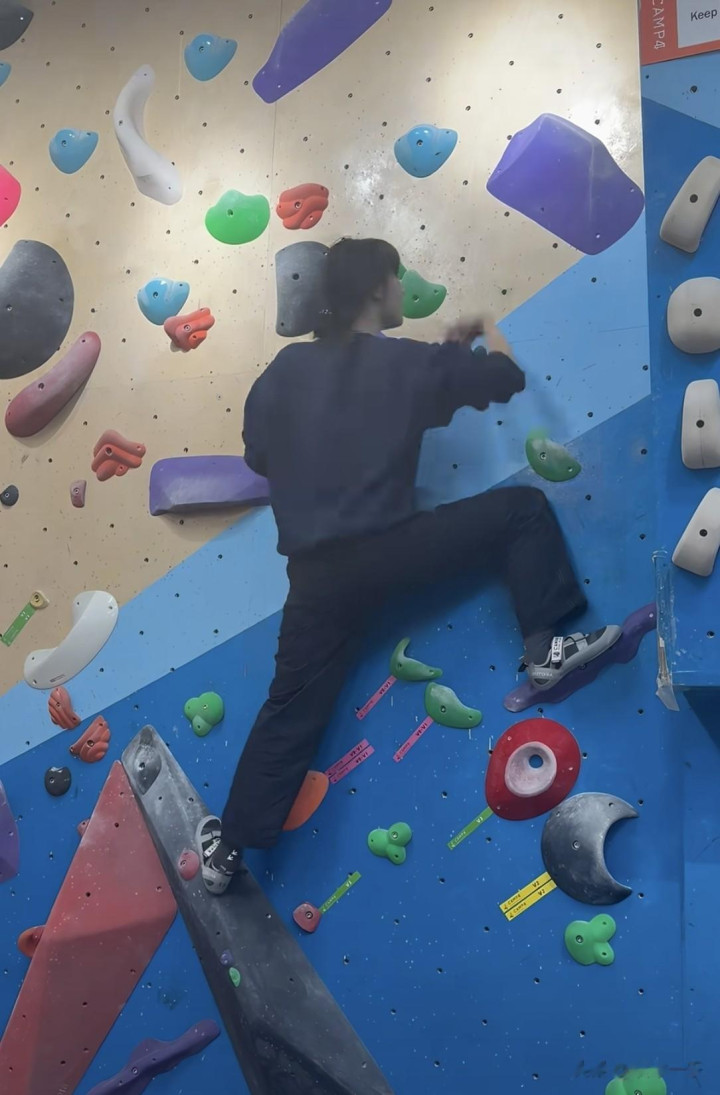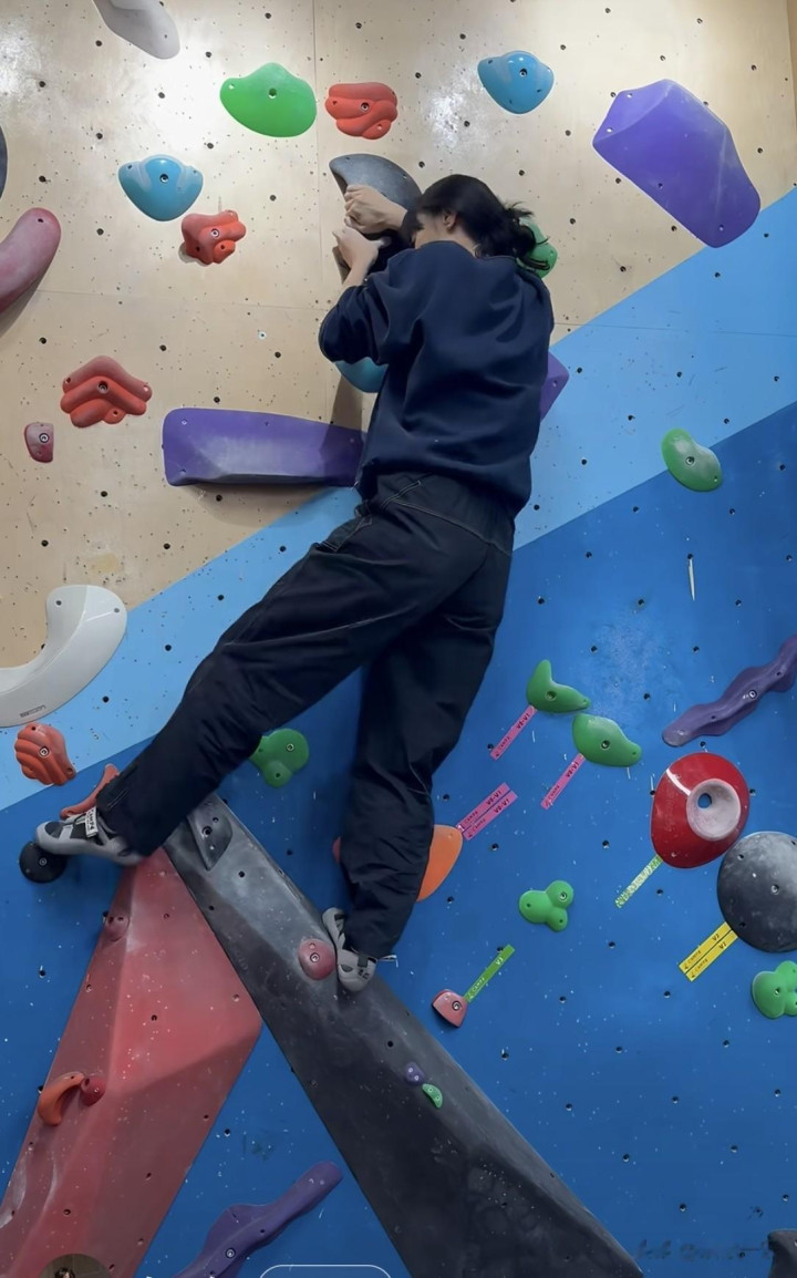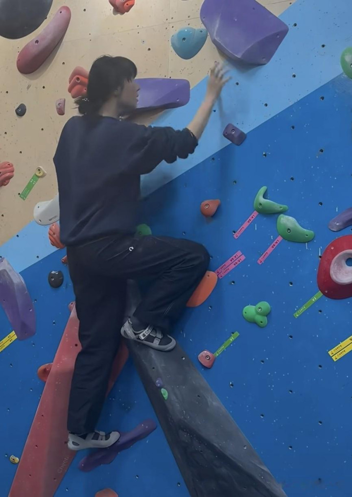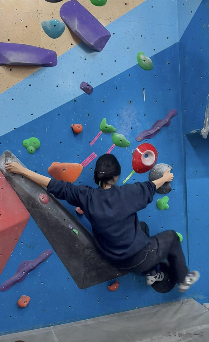 站在色彩斑斓的攀岩岩壁前,她的动作舒展又灵活,抬手抓握岩点、抬脚踩住岩壁的瞬间,身姿轻盈利落,丝毫不见笨重感,能明显看出比之前瘦了一圈,状态肉眼可见的回春。